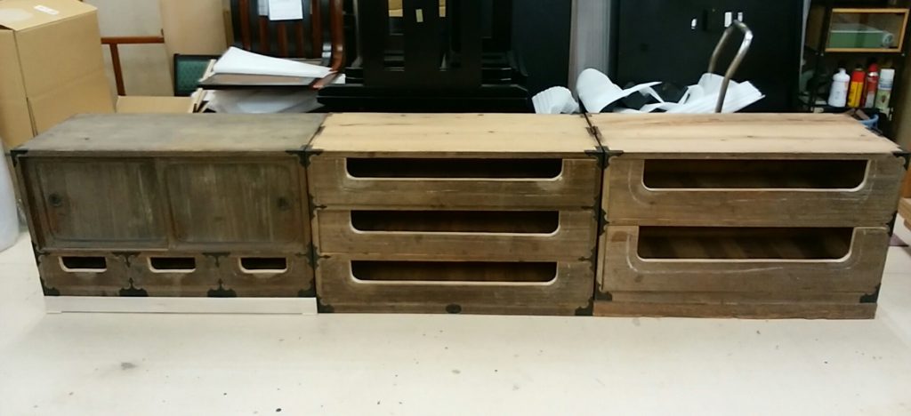 整理タンスのリニューアルby tezuka2022年6月10日2022年6月10日 桐の整理タンスをゆかた棚へとリニューアルしました。 3段上に積み重なっていたタンスを、旅館さまのゆかた棚として横に並べるデザインへとリニューアル。 とても素敵にリニューアルされました!! お預かりした桐の整理タンス ゆがみを直し引き出しの中身が見えるように手作業でくり抜き、高さを合わせて横並びにした状態 塗装して上に天板を乗せ、完成!!くり抜きの部分に朱を塗ったアクセントが恰好いいです! タグ:タンスのリニューアル桐の整理タンス コメントを残す コメントをキャンセルメールアドレスが公開されることはありません。 ※ が付いている欄は必須項目です名前 ※ メール ※ サイト コメント ※ 次回のコメントで使用するためブラウザーに自分の名前、メールアドレス、サイトを保存する。
