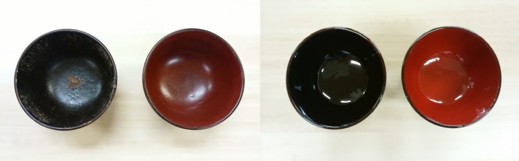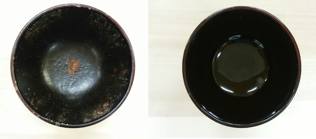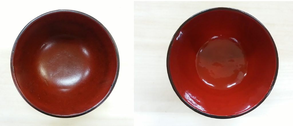 黒い椀の内側の剥がれが大きく、外側も塗りの艶が全くなくなっていました。
